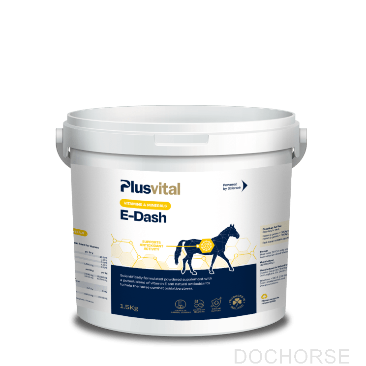 Plusvital E-Dash is een wetenschappelijk geformuleerd poedervormig supplement dat een krachtige combinatie bevat van vitamine E, selenium, vitamine C en natuurlijke antioxidanten ter ondersteuning van het algemene welzijn van paarden.